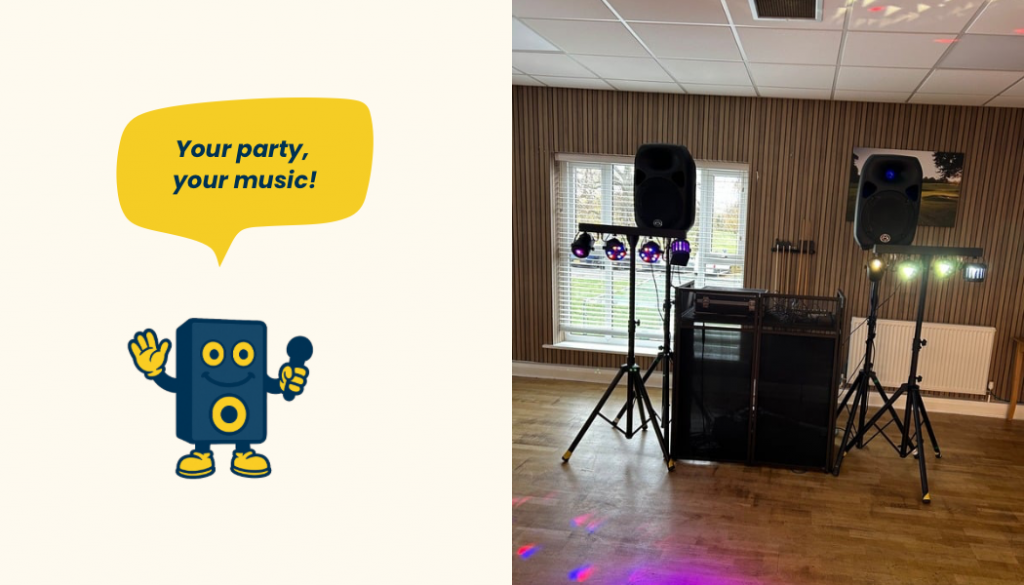 Looking to play your own music at your party? Hire our complete DIY DJ party setup – speakers, disco lights, and a professional booth. Connect your phone or laptop and press play.